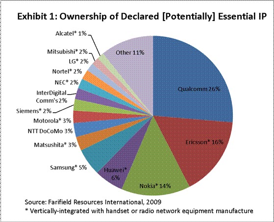 Exhibit 1, based on data from a 2009 study funded by Nokia, shows that leading implementers Ericsson, in radio network equipment, and Nokia, in handsets, declared IP ownership amounting to 16% and 14% respectively of the total for 3GPP mobile communications standards with WCDMA. Leading technology and chipset provider Qualcomm declared 26% ownership. (Many have claimed the study methodology is flawed. The input data is used here to demonstrate the well accepted fact that many companies have patents related to these standards).